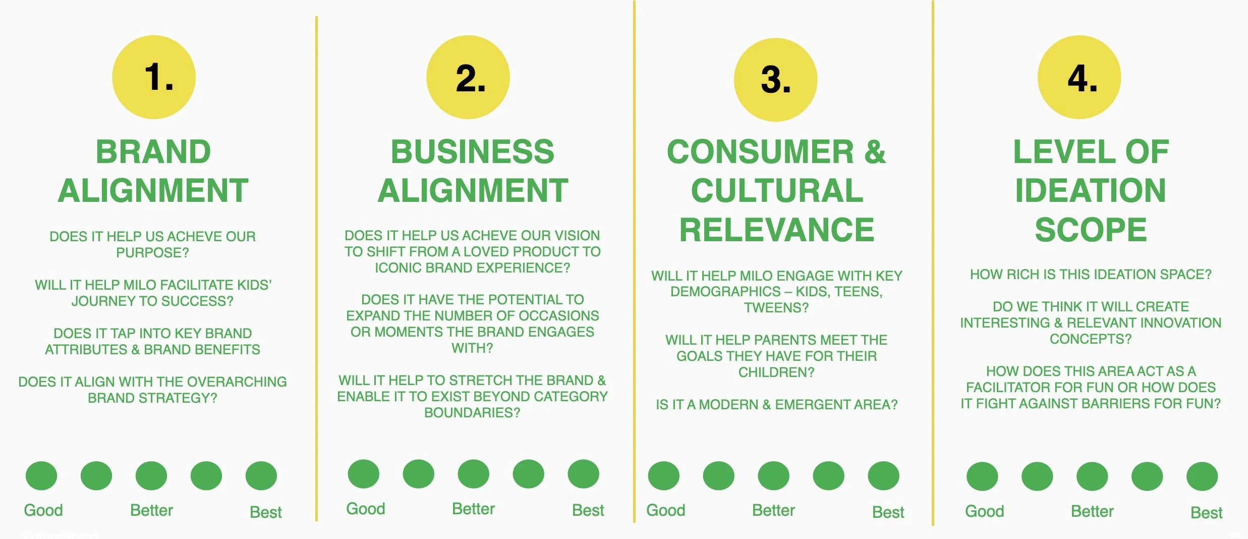 Working across key markets in Thailand, Vietnam, Cambodia and Australia, we combined category insights with consumer / cultural insights to develop an understanding of the opportunities afforded to the much-loved brand. This allowed us to push the brand and build on the core capabilities of the portfolio to step towards any whitespace that would provide growth and new ideas. Working firstly inside the milk drinks category, and then looking more broadly out of category at both kids’ activities and parental needs, we built a pack of opportunities areas that were evaluated against a series of criteria to allow the best ideas to surface.